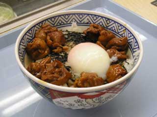 2Schale Reis mit Geflügel, Seegras und halb gekochtem Ei, für 380 Yen, etwa 3 Euro